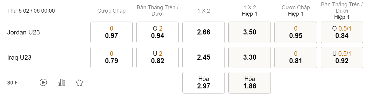 Soi kèo châu Á U23 Jordan vs U23 Iraq: 0.97*0*0.79